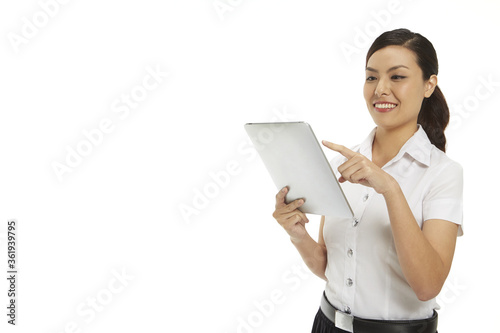 holding, scrolling, smiling, standing, color image, half face, isolated, femininity, thai, siamese, woman, young, individuality, feminine, individual, connection, communication, technology, wireless, portable, cheerful, leisure, hobby, hobby, siam, asian, asian ethnicity, missy, one person, cut-out, well-dressed, touch screen, adults only, studio shot, lifestyle