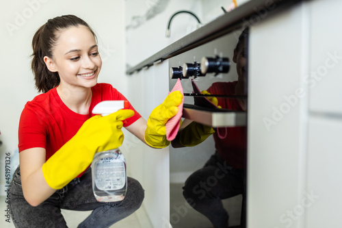 Happy woman with bottle of spray cleanser cleaning oven at home kitchen