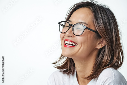 woman, female, girl, smile, happy, cheerful, excited, goggles, eyewear, red, lipstick, white, shirt, background, portrait, studio, closeup, beautiful, attractive, fashion, style, model, joy, fun, positive, young, adult, brunette, short, hair, natural, casual attire, real, authentic, genuine, carefree, optimistic, confident, healthy, skincare, teeth, bright, fresh, energetic, energy, vibrant, sparkling, youth, youthful