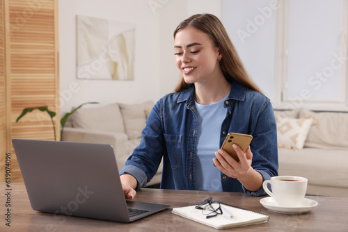 Happy woman with smartphone and laptop at wooden table in room