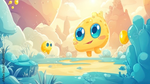 happy, yellow, creature, fantasy, landscape, whimsical, floating, coin, glowing, cute, cartoon, illustration, digital, art, magical, playful, adventure, fun, dreamy, vibrant, colourful, bright, cheerful, joy, wonder, childlike, innocent, sweet, adorable, friendly, charming, peaceful, serene, tranquil, beautiful, stunning, amazing, majestic, enchanting, captivating, delightful, extraordinary, marvellous, fantastic, remarkable, superb, excellent