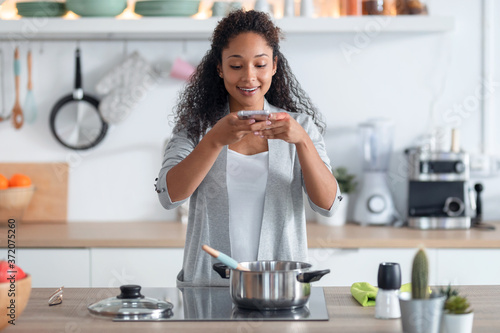 Happy young african american woman cooking healthy food while taking a photo with her mobile phone in the kitchen at home.