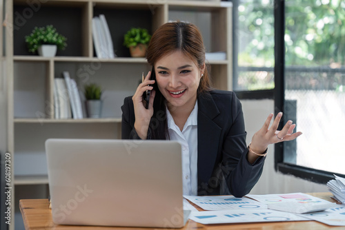 Happy young asian business woman talking on the mobile phone and smiling while sitting at her working place in office