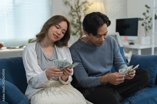 money, couple, counting, finance, home, dollar, cash, savings, budget, investment, sofa, asian, bank, wealth, payment, loan, salary, income, earning, rich, currency, economy, financial, accounting, debt, mortgage, expense, profit, house, apartment, interior, living, room, happy, smiling, man, woman, family, lifestyle, indoor, asia, together, holding