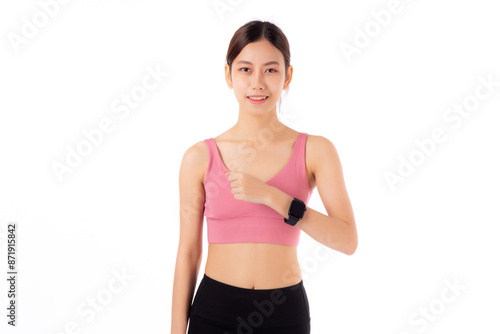Happy young asian woman looking and show smartwatch for exercise and aerobics with cardio isolated on white background, female looking smart watch while workout with health, sport concept.