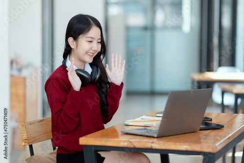 Happy young asian woman wearing earphones and using laptop computer at desk in office, Female student with stack of books and laptop.