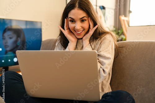 woman, female, girl, people, person, laptop, connection, computer, greeting, web log, cheerful, happiness, cyberspace, technology, smiling, sitting, looking, couch, sofa, home, house