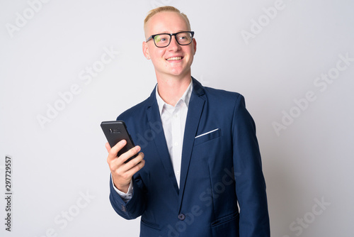 businessman, suit, young, people, portrait, man, blond, studio, shot, isolated, white, background, person, caucasian, 20s, male, man, adult, blond, hair, business, corporate, executive, formal, entrepreneur, eyeglass, nerd, hipster, happy, happiness, smile, smiling, thinks, thinking, idea, inspiration, looking, up, phone, mobile, technology, using, holding, smartphone, cyberspace, mobile phone, communication, connection, message, texting