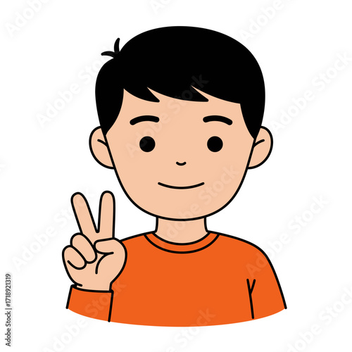 boy, children, children, person, male, youth, young, human, character, individual, portrait, bust, head shot, face, avatar, icon, black, hair, short, coiffure, eye, smile, smiling, happy, cheerful, friendly, cute, adorable, pleasant, gentle, calm, orange, shirt, sweater, top, clothes, clothing, apparel, casual attire, gesture, gesticulate, hand, signs, peace, victory, 2, finger, showing