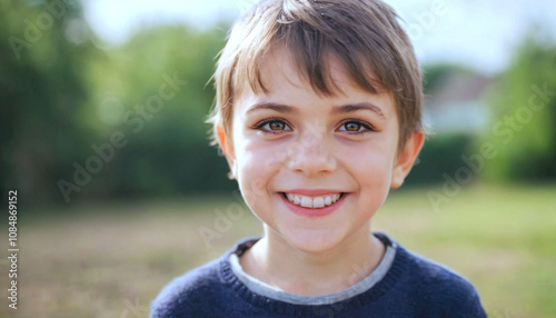 Happy young boy with bright smile enjoying a sunny day outdoors in a natural setting with greenery in the background and a cheerful expression on his face