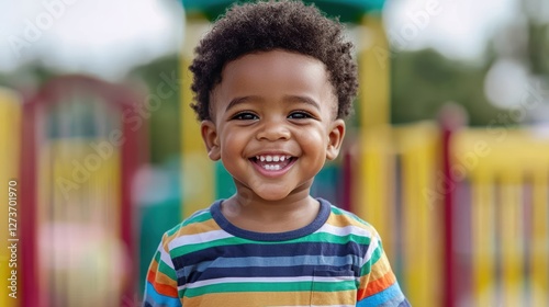 Happy Young Boy with Curly Hair Smiling in Playground Setting Surrounded by Colorful Play Equipment