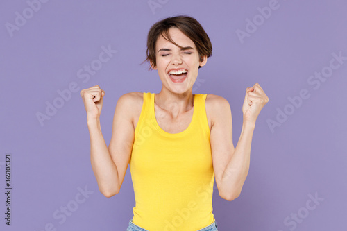 Happy young brunette woman girl wearing yellow casual tank top posing isolated on pastel violet wall background studio portrait. People lifestyle concept. Doing winner gesture, keeping eyes closed.