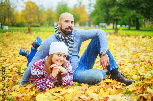 happy, couple, man, woman, boy, girl, love, happiness, park, nature, autumn, fall, season, smile, joy, positive, beautiful, attractive, male, female, people, 2, person, portrait, casual attire, caucasian, fun, leaf, yellow, carefree, hug, hugs, affection, husband, wife, family, romantic, romance, partner, loving, beard, bold, affectionate, friends