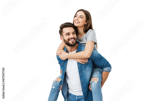 Happy young couple enjoying a piggyback ride together, isolated on transparent background