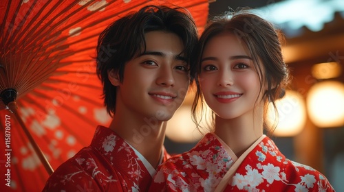 couple, love, romance, happy, smile, kimono, japanese, tradition, culture, asia, man, woman, red, umbrella, fashion, beautiful, pretty, photogenic, attractive, young, portrait, human relationships, together, dating, intimacy, affection, joy, happiness, celebration, wedding, ceremony, festival, elegant, style, photoshoot, model, people, oriental, asian, garment, clothing, background, scene, image, photo, picture, chinese, vietnam, smiling