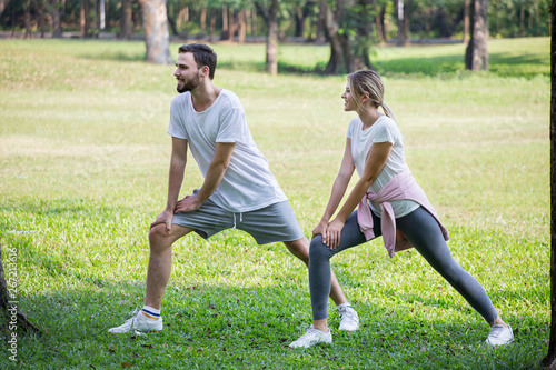 Happy young couple loving fitness in sportswear stretching leg for exercising or running at park together in morning time. sport people . relationships. training , workout
