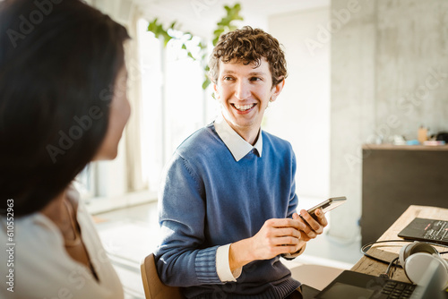 Happy young entrepreneur holding smart phone discussing with colleague in creative office