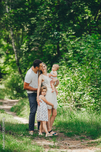 Happy young family spending time together in green nature park. Mother and father kissing baby daughters.