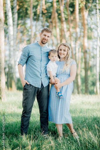 Happy young family spending time together outside in green nature