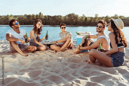 happy young friends drinking beer while relaxing on sandy beach at riverside