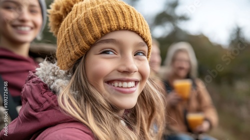 girl, young, happy, smiling, face, eye, teeth, hat, knit up, yellow, jacket, red, brown, blond, hair, long, winter, cold, weather, outdoors, nature, wood, tree, forest, autumn, fall, season, joyful, cheerful, bright, warm, cute, pretty, beautiful, skin, portrait, sharpened, blurry, background, people, person, female, caucasian, children, children