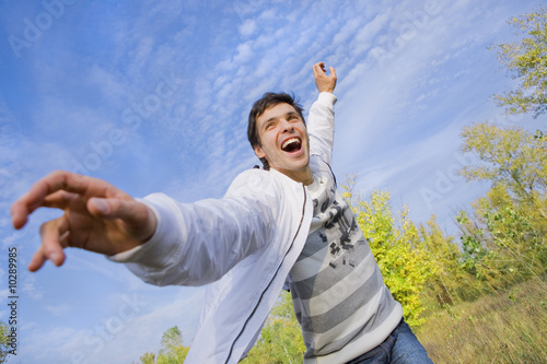 man, young, smile, jump, fly, fly, jean, sky, blue, cloud, happiness, happy, autumn, against, tree, clothes, fun, male, energy, fit, victory, portrait, white, adult, background, beautiful, nature, park, people, person, romantic, valentine