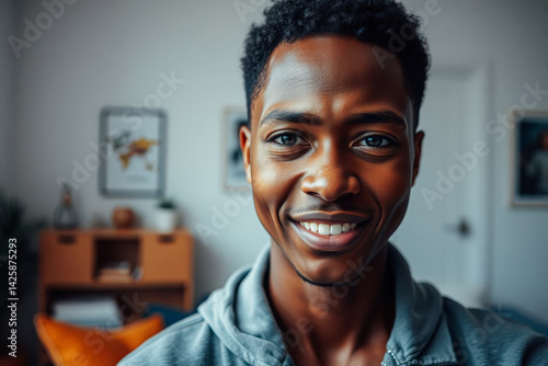 portrait, man, young, smiling, happy, face, photogenic, positive, cheerful, casual attire, hoodie, indoor, home, lifestyle, cosy, interior, african american, black man, culture, diversity, people, beauty, person, model, closeup