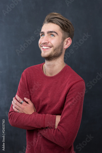 portrait, black, background, man, isolated, photogenic, educational, hand, blackboard, attractive, educate, copy, white, arm, teacher, academy, study, lecturer, prof, studio, blackboard, chalk, lesson, class, smile, folded, young, standing, blue, student, t-shirt, university, looking, education, board, space, lecture, camera, crossed, confident, happy