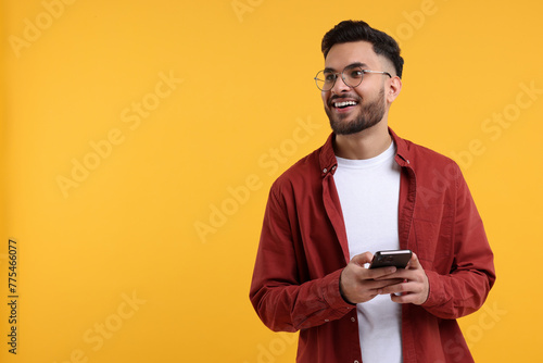 Happy young man using smartphone on yellow background, space for text