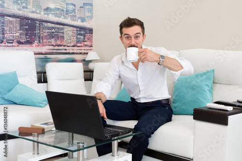 laptop, studying, distance, sofa, guy, day, hot drink, sitting, business, new, drink, adult, cyberspace, male, light, notebook, casual attire, morning, people, caucasian, smiling, technology, type, computer, tea, learning, beard, modern, paperwork, lifestyle, young, age, holding, desk, check, interior, person, student, joyful, home, looking, work, office, man, screen, happy, businessman, communication, online