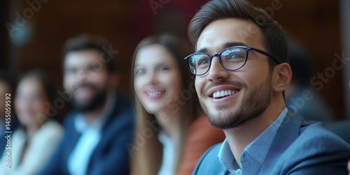 Happy young man with beard and glasses, part of a group of people engaged in discussion or presentation.