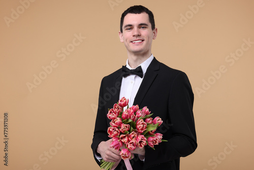Happy young man with beautiful bouquet on beige background
