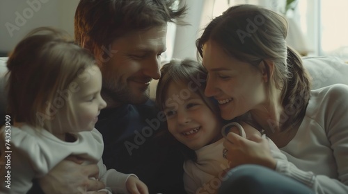 Happy young mother and father with two little daughters sitting on couch looking at each other family enjoying tender moment smiling parents and preschool children having fun together : Generative AI