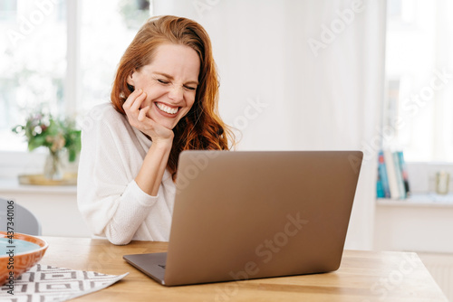 laptop, woman, fun, laughing, computer, young, beautiful, technology, cyberspace, online, virtual, relaxed, laughter, funny, social network, joy, interactive, comedy, watching, comical, comic, humorous, copy space, positive, redhead, notebook, home, happy, cheerful, smile, enjoy