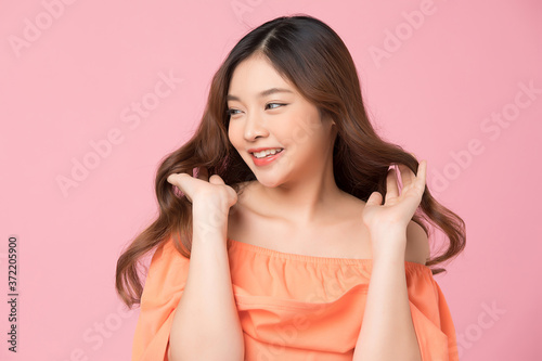 asian, woman, young, happy, portrait, female, pink, isolated, background, expression, cheerful, gesture, smile, lady, cute, people, stylish, glamour, adult, attractive, beautiful, beauty, brunette, face, fashion, fresh, girl, model, person, pretty, studio, style, hand