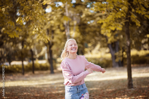 active, adult, alone, autumn, blond, cheerful, dancing, enjoyment, female, fun, girl, happy, lifestyle, motion, nature, outdoors, park, people, person, portrait, running, season, smiling, walking, woman, young