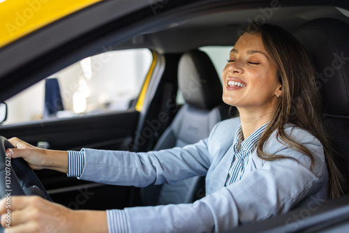 Happy young woman testing new car before buying in showroom salon, concept buy first vehicle.. Test drive of new vehicle