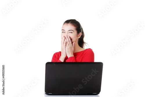 20s, adult, attractive, background, beautiful, beauty, browsing, brunette, business, casual attire, caucasian, surprised, communication, computer, confident, education, girl, happy, holding, cyberspace, isolated, laptop, learning, lifestyle, looking, shocked, notebook, online, people, portable, portrait, sitting, smile, student, studio, study, successful, surfing, tech, technology, table, university, web, white, wireless, woman, web, young