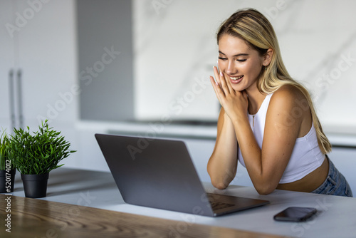 woman, kitchen, laptop, computer, technology, home, caucasian, apartment, house, female, lifestyle, household, young, adult, girl, 1, portrait, pretty, smile, cyberspace, domicile, modern, happy, notebook, beautiful, domestic, casual attire, morning, indoor, racked