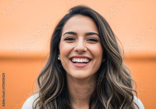 happy woman, orange background, warm colors, warm light