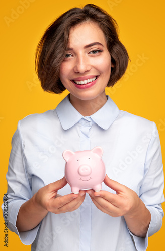 woman, money box, money, save, smile, show, finance, economy, colourful, bright, female, brunette, young, cheerful, happy, cash, investment, joy, wealth, demonstrate, high-coloured, optimist, positive, money box, earning, fund, account, budget, modern, vibrant, deposit, delight, profit, satisfied, friendly, glad, rich, content, pleasure, casual attire, blouse, yellow background, vertical, studio shot, isolated