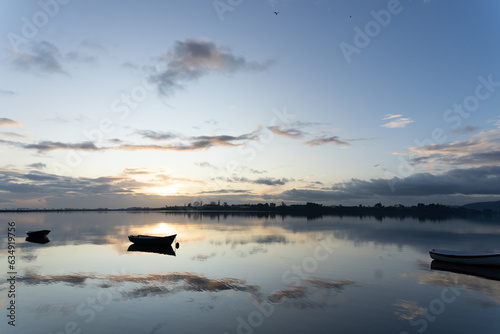 Harbour sunrise with small boats in silhouette back-lit by rising sun.