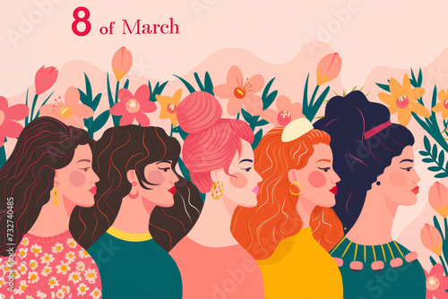 Harmonious illustration of five women profiled against a floral backdrop, celebrating '8 of March' with grace and unity.