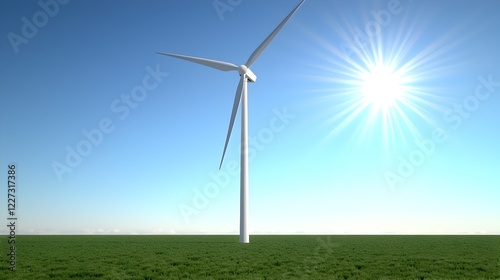 Harnessing Nature's Power: A wind turbine stands tall in a vibrant green field under a bright sun, symbolizing clean energy.