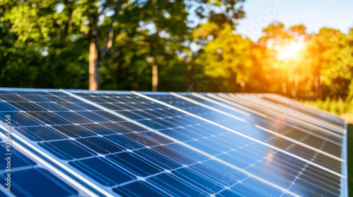Harnessing solar energy, this showcases solar panels reflecting sunlight in lush green environment. advancements in renewable energy are evident as sun sets, highlighting importance of sustainable
