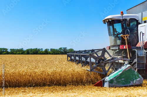 Harvester machine to harvest wheat field working. Combine harvester agriculture machine harvesting golden ripe wheat field. Agriculture