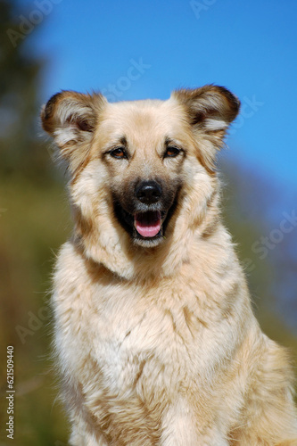 dog, sheepdog, look, look, watchful, sitting, grass, heaven, blue, athletic, submissive, animal, pet, pretty, portrait, brown, mammal, nature, drover, fur, purebred