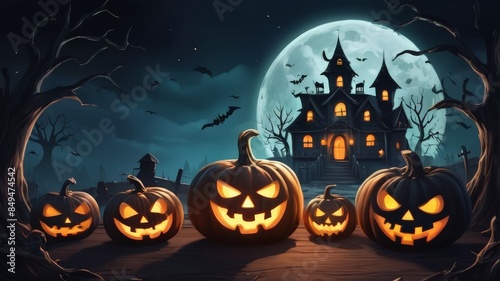 Haunted house at Halloween with moon and bats at night as scary background illustration. Halloween Spooky House