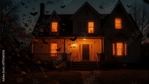 Haunted Victorian House at Night with Bats and Falling Leaves for Halloween Celebration