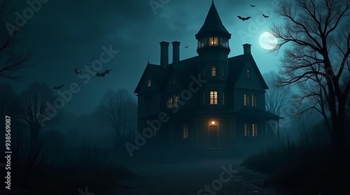 Haunted Victorian Mansion Silhouette: Spooky Halloween Night Scene with Full Moon and Bats